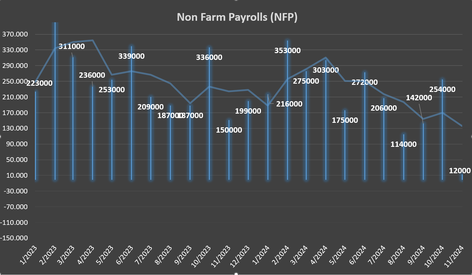 Este riesgo extremo mostraría un mercado laboral fuerte y robusto, propio de una economía inflacionaria y que no necesita empujes. De primeras sería un dato extremadamente alcista para el dólar pudiendo sentenciar por completo toda esperanza de recorte en diciembre, aunque también convendría ver la naturaleza de esos empleos y la tasa desempleo.